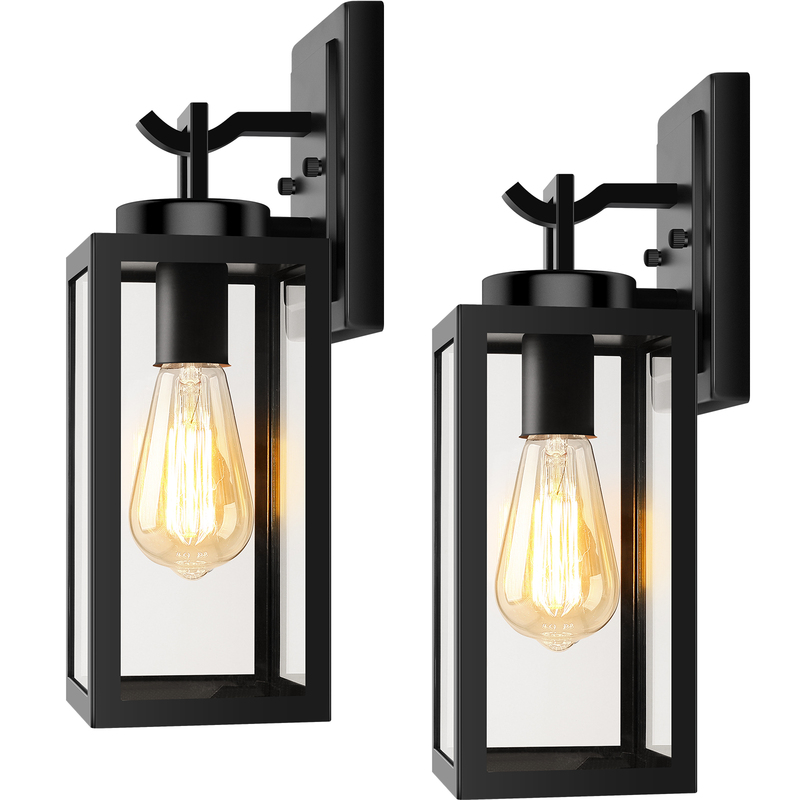 【Classic & Stylish Appearance】: our exterior garage wall light is elegant and attractive, metal frame finished with matte black surface to match with clear glass, creating modern and farmhouse style. The clear glass presents a eye-catching light when illuminated by bulb, bringing a charming and simplistic look to your house. What's more, our modern black outdoor wall lights feature with an open bottom design make it easy to change bulbs and clean lanterns.